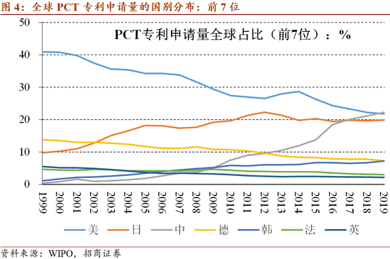 根据世界知识产权组织(WIPO)发布的PCT专利申请量,美国PCT专利申请量占全球比重已从2001年的40%左右降至2019年的21.8%。中国占比从2001年的1.6%左右升至2019年的22.3%。日本占比近十多年来稳定在20%左右。德国占比从2001年的13.0%降至2019年的7.3%。韩国占比从2001年的2.1%升至2019年的7.2%。而全球其他经济体的占比则从2001年的32.5%降至2019年的21.6%。