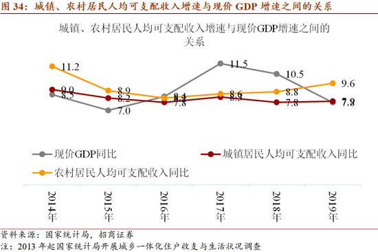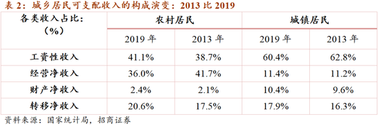 3. 城乡居民可支配收入的构成演变:总体而言,工资性收入是城镇居民收入的主体,占比60%以上;而农村居民收入中工资、经营、转移形成4:4:2的结构。从边际变化看,从2013年至2019年,城镇居民工资性收入占可支配收入的比重出现下降,经营净收入占比基本稳定,而财产净收入、转移净收入的占比出现上升;农村居民的工资性收入、转移净收入的占比都有明显上升,财产净收入占比小幅提升,而经营净收入占比则出现下降。