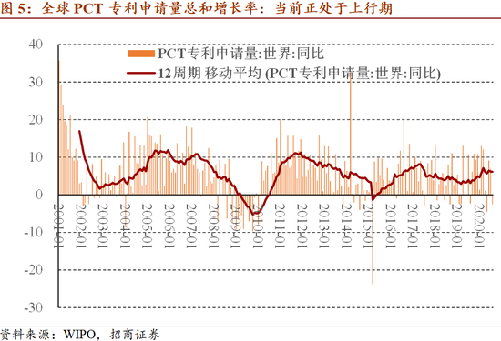 全球PCT专利申请量同比增速略滞后于全球经济周期。2002、2009、2015是三次低谷,前两次分别与2001年IT泡沫破裂、2008年全球金融危机相对应,最近一次从2015年上半年回升(2015年也是全球经济的低谷时期)至2017年中期见顶(2017年也是全球经济最近一次高峰),之后趋于回落。