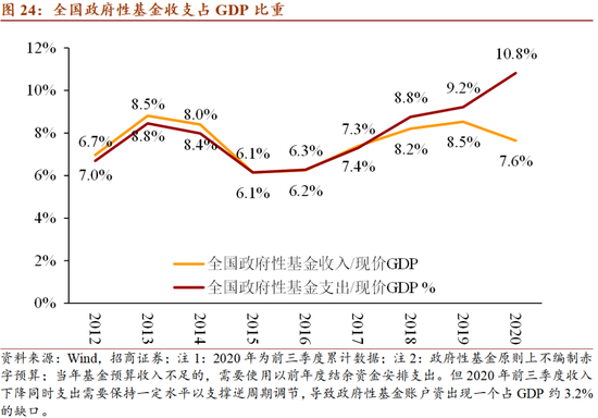 2. 宏观税负:从财政收入占GDP比重来看,2015年以来随着增值税改革及一系列降税措施的推进,全国公共财政收入占GDP比重已经从22.1%持续下降至19.2%。在公共财政账户之外,中国还有政府性基金(其中90%为国有土地使用权出让收入)、国有资本、社保基金等广义财政账户。其中政府性基金是地方政府财政的重要补充,其收入占GDP比重已经从2015年的6.1%上升至2019年的8.5%,但2020年前3季度出现回落;社保账户收入占GDP比重也持续上升至8.6%,2019年小幅回落至8.4%。