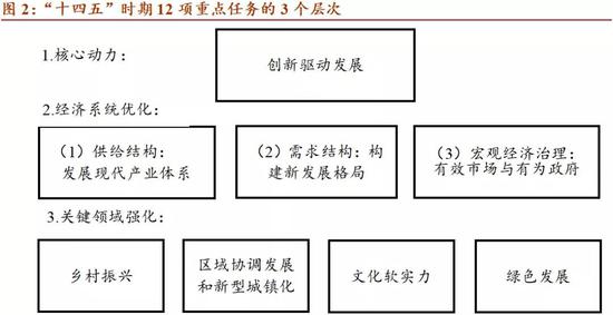 “十四五”时期重点发展的领域,依次包括科技创新、现代产业体系、新发展格局、市场经济体制与宏观经济治理、乡村振兴、区域协调与城镇化、文化事业、绿色发展、高水平对外开放、民生、安全、国防共12个方面,这12项任务形成了一个三层次的架构。