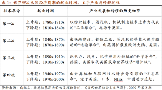 突破性的技术进步会引领长波经济周期。每个长波周期跨度约为半个世纪。按熊彼特、康德拉基耶夫的研究,近代世界经济发展过程可以划分为三个长波周期:“工业革命”、“运输革命”和“科技革命”。进入现代社会,始于20世纪40年代并持续到21世纪,由计算机和互联网技术引领的“信息革命”又形成了第四次长波周期。未来,世界经济还会继续由能源技术、生物技术等技术进步所驱动。