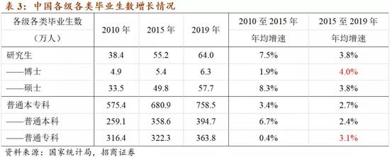 从各级各类毕业生人数增长情况来看,过去10年,每年高等教育毕业生(研究生、普通本科、普通专科总量)占城镇新增就业人口的比重已经从51.6%升至60.8%,已经从边际上改善了城镇就业人口的受教育水平。从结构来看,“十三五”时期博士研究生、普通专科毕业生数出现了加速增长,而硕士研究生、普通本科毕业生数出现了下降。