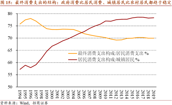 3.1.最终消费结构:首先居民消费支出与政府消费支出的比例自金融危机以来都稳定在3:7,而金融危机之前政府消费支出占比显著上升;其次城镇居民与乡村居民的比例也自2010年以来放缓了上行趋势,城镇消费占比仅从77.0%升至78.3,而这是在城镇化率从50%升至60%的基础上实现的,反映出乡村居民消费增长更快。最后分消费种类看,对比2013年与2019年,城镇居民食品、衣着等实物消费占比下降,而医疗保健、教育文化娱乐、居住等服务消费上升较为明显。