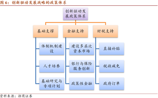 创新驱动发展战略的政策体系可以分为基础支撑、财税支持、金融支持三个方面。其中基础支撑主要包括体制机制建设、人才培养、基础研究与专项计划等,属于中长期政策;财税支持主要包括直接补贴、税收减免、政府订单等;金融支持主要包括政策性金融、多层次资本市场建设,以及金融产品创新等。