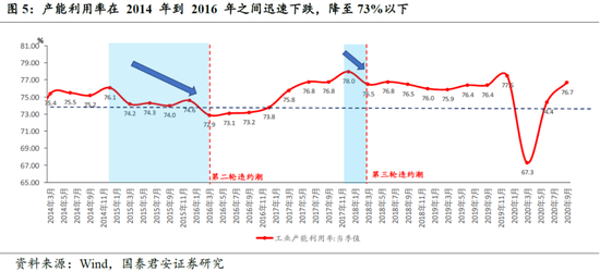 2)第二波违约潮之前,我国产能利用率从2014年的小高峰再次震荡下行将近2年,下行3个百分点至73%,为金融危机前谷底水平。