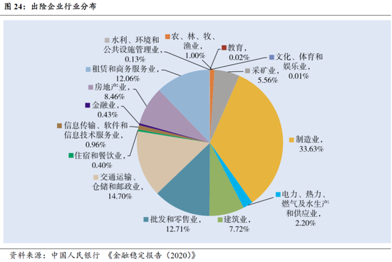 此外,在2020年的《金融稳定报告》中,央行撰写了《大型企业风险监测》专题,报告指出,2013年,人民银行开始对大型企业出险情况进行监测,加强预警、研判。截至2019年末,全国共有575家大型企业出险,其中,460家企业出现严重流动性困难、120家企业未兑付已发行债券、27家企业股权被冻结、67家企业申请破产重整(图24)。575家出险企业融资规模为3.88万亿元,其中6462亿元已被纳入不良资产。