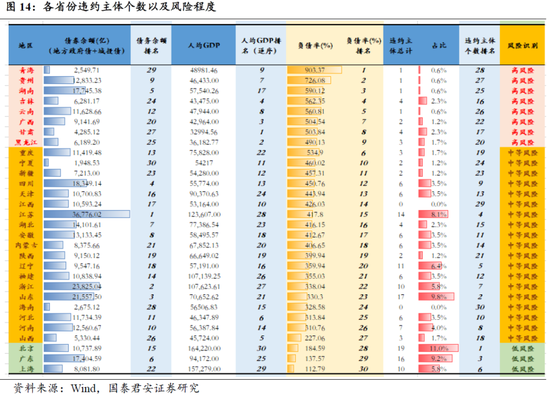 我们同样梳理了违约主体所在的地区,并且结合地区的公共财政收入以及地方债务水平(城投债+地方政府债)计算的负债率来判断违约最有可能发生在哪些区域,并且下一个“雷”最可能在何地出现。