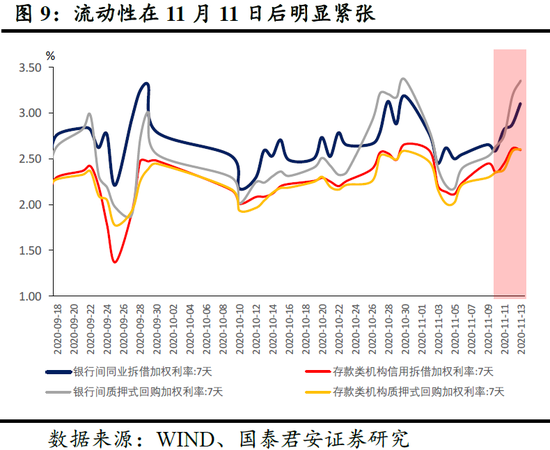 不同之三:货币政策尚未收紧,但当前正在社融信用扩张的尾声阶段。当前宏观背景是流动性并没有特别紧张,不同于第一波、第三波违约潮,但2021年将是信用收缩之年,需要关注此次“违约事件”的蝴蝶效应,警惕信用风险向流动性风险演化之势。地方国企的信用利差在11月11日后明显走扩,但民营企业信用利差在此次违约中却没有。流动性方面,11月11日后,R007、DR007出现了明显的上行(图9、10)。