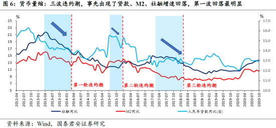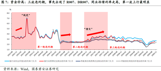 三波违约潮,无一例外,宏观环境均领先或同步出现了“货币收紧”(图6-8):