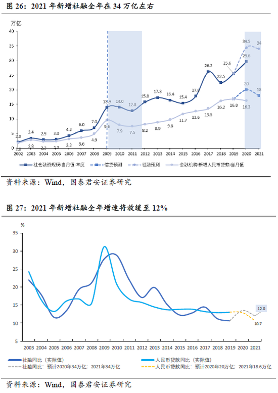 2021年,货币政策将进一步“分道而行”,货币维持中性,信贷政策将迎来结构性缩减。我们预计新增社融全年在34万亿左右,增速将放缓至12%。这一部分是来源于“紧信用”,即信贷量的放缓,同样比对2009年后的信贷节奏,我们认为2021年信贷总量上必然将明显的边际收紧(图26、27),大约下降至18.5万亿左右。