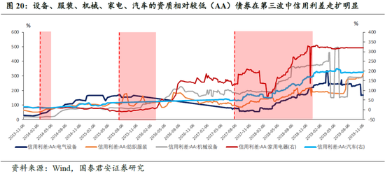 此外,从评级角度,三次违约潮中,高等级和中低等级的信用利差走扩分化程度呈现第三波>第二波>第一波。第二波中相对低资质(AA)的上游采掘、黑色有色、中上游化工类债券信用利差攀升更为剧烈;设备、服装、机械、家电、汽车的资质相对较低(AA)债券在第三波中信用利差走扩更为明显。