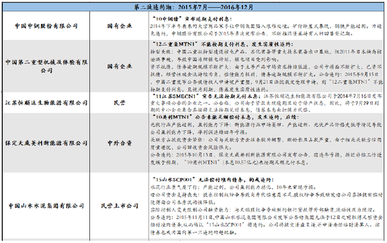 1)第一波,2014年3月-2015年下半年,违约集中在新能源行业,比如光伏行业的“超日债”等。违约涉及36只债券,25家违约主体,首次违约时债券余额在127.2亿元,其中大部分是新能源企业,光伏行业占6家,占近20%。除保定天威评级在AA+以外,其他主体均在AA及以下,并且民营占大多数。