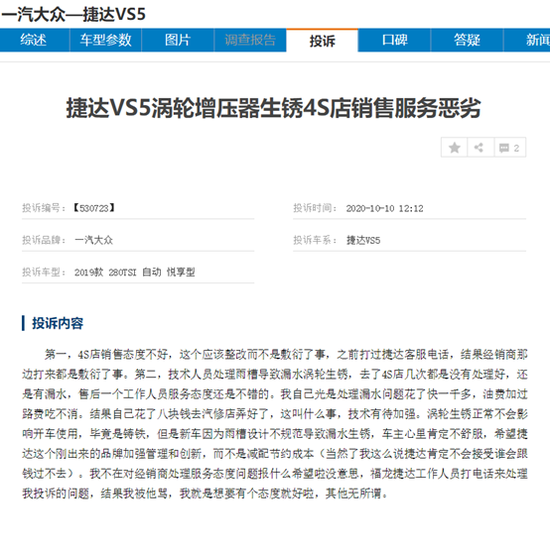 一位2019款自动悦享型捷达VS5车主张先生(化名)在投诉涡轮增压器生锈问题中提到,4S店的态度不好,与此同时,车身漏水导致的涡轮生锈几次都没有修好。“涡轮生锈正常不会影响开车使用,毕竟是铸铁,但是新车因为雨槽设计不规范导致漏水生锈,车主心里肯定不舒服,希望捷达这个刚出来的品牌加强管理和创新,而不是减配节约成本。”