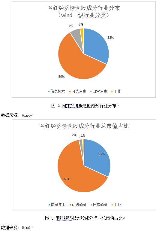 2016年4月7日,Wind资讯编制并发布了网红经济指数(884211.WI),包含了共计44只网红经济概念成分股,涉及信息技术、可选消费、日常消费、工业四类行业(根据Wind一级行业分类标准),总市值达6,361.18亿元,涵盖社交电商平台、网络直播平台、电竞平台、网红带货、MCN等相关领域企业。其中以可选消费行业和信息技术行业企业为主,可选消费行业企业共26家,总市值4135.75亿元,信息技术企业共14家,总市值2028.34亿元。