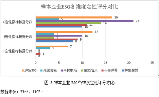 通过对比样本企业与沪深300上市企业的ESG平均得分,总体来看,网红经济概念成分股的ESG总得分及三个维度的具体表现均明显低于沪深300平均分,说明“网红经济”产业内企业ESG表现水平欠佳,整体产业尚未树立可持续发展理念,ESG风险管理能力有待提高。同时,5家企业中仅有芒果超媒公开发布企业社会责任报告,全部44家网红经济概念成分股企业中也仅有9家定期发布社会责任报告,说明“网红经济”产业内企业ESG信息披露有限,有待进一步将ESG纳入企业的管理体系,提高信息披露水平。