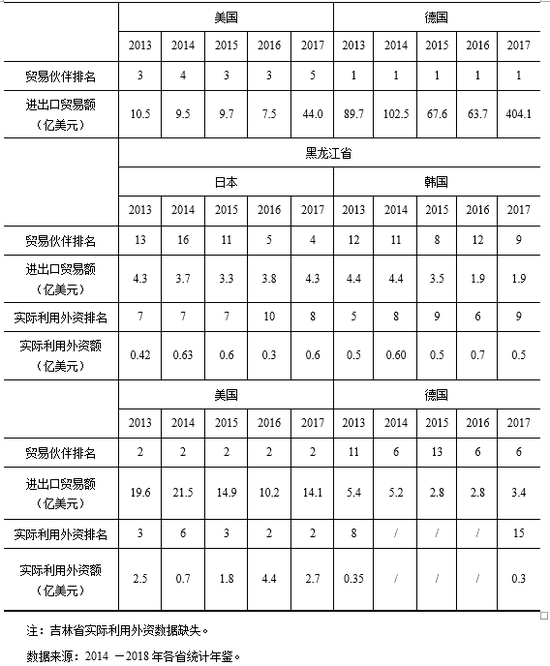 东北目前与“东西方”贸易投资的关系,从表4-2可以看出,在多数时间里,东北与上述4个国家的贸易和投资往来都占据前5位。其中:辽宁与东北亚贸易往来比较多,2013—2017年与日本的贸易往来始终处在第一位;黑龙江、吉林对美国、德国的贸易及投资体量比较大;而辽宁的经济贸易与投资的体量均大于吉林和黑龙江的总和。将东北三省汇总来看,虽然东方和西方都是东北地区重要的贸易伙伴,但是总体上,目前东北地区与东北亚的贸易往来更加密切。
