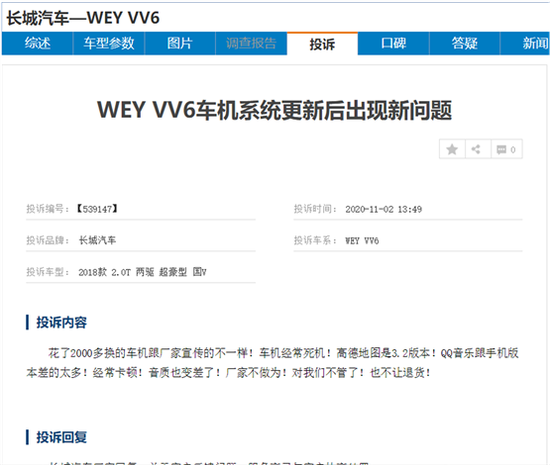 另有2018款 2.0T 两驱 超豪型VV6车主投诉:“花了2000多换的车机跟厂家宣传的不一样!车机经常死机!高德地图是3.2版本!QQ音乐跟手机版本差的太多!经常卡顿!音质也变差了!厂家不作为!对我们不管我了!也不让退货!”