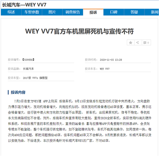 一2017款 VV7旗舰型车主孙先生(化名)在投诉中提到,其在安装官方WEY道 APP上购买的车机后,引发了发动机熄火、出现噪音等情况,车机也出现黑屏死机、信号不稳等问题。并强调:“本次投诉是针对长城汽车WEY派厂家,不对4S店。”
