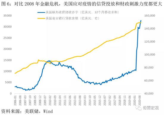 这次应对疫情,和2008年金融危机时很不一样。金融危机爆发后,美国以救助金融机构为主,给实体的信贷支持并不多,流动性主要以超储的形式存放在美联储那里。而本次疫情中,美国商业银行体系给实体的信贷支持力度要明显大于金融危机时期,应对危机的财政政策也更为积极,通过多种形式直接给企业和家庭发放现金。