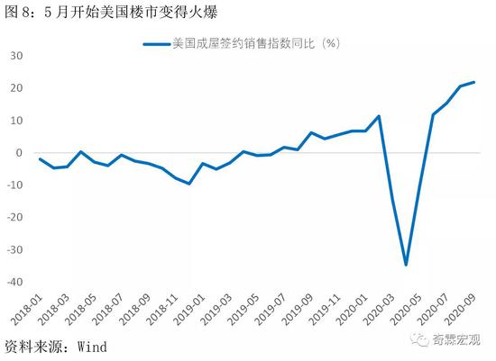 货币宽松的环境,叠加疫情冲击下有钱人和中产们改善型的购房需求(郊区独栋别墅要比城区的楼房安全),也让美国房地产市场变得火爆起来。全美地产经纪商协会公布的成屋签约销售指数同比,从5月的-10.4%跳升到6月的11.8%,此后继续回升,最新公布的是9月数据,为21.9%。
