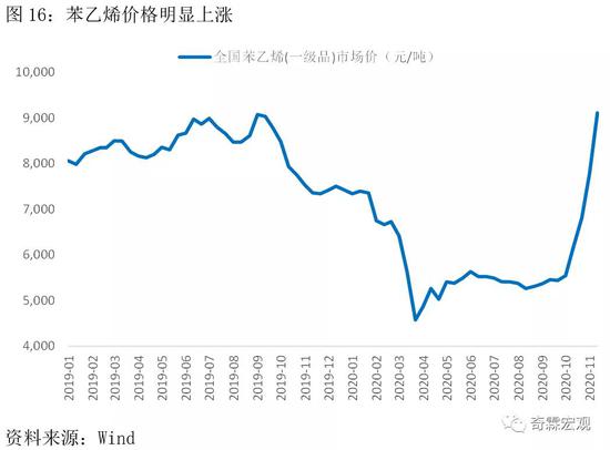 前面也提到过,由于出口很好,经济需求强,我们发现企业开始主动补库存了。很明显,近期上游各类工业品的价格非常强势。有限产压力的焦煤、焦炭就不说了,连供给相对过剩的苯乙烯(对应家电和汽车的需求)都开始大幅上涨,需求的强劲可见一斑。