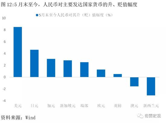 从单边汇率看,5月末至今,除对美元和日元外,人民币对主要发达国家货币的升值幅度并不大,对澳元和新西兰元甚至是贬值的。