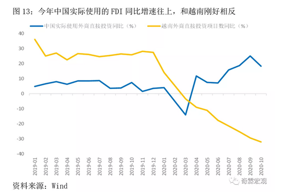 我们看到,今年中国实际利用的外商直接投资同比增速,整体是在往上走的,这和最近几年外资青睐的越南走势相反。当然我们不是想说越南不受外资喜欢了,而是想通过这个对比,来说明中国对外资仍然有很强的吸引力。
