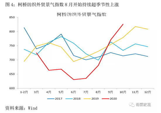 订单转移最典型的例子是纺织业。10月有篇媒体报道称,新冠疫情给印度的纺织业造成很大冲击,部分订单转移到了中国,国内有些纺织企业新接订单的生产都排到明年5月了。纺织业出口订单的激增,在柯桥纺织外贸景气指数上也得到了体现,这个指数从8月开始,就持续超季节性上涨。