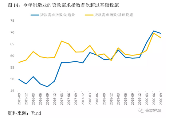 如果说制造业中长期贷款高增长有政策的引导作用,那么贷款需求指数,更能够真实反映制造业企业自发的贷款意愿。对比央行统计的分行业贷款需求指数,可以发现今年有个显著的特点是,制造业企业的贷款需求,首次超过了基础设施,制造业企业的内生性贷款需求也在快速回升。