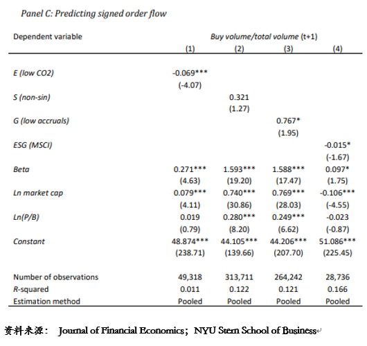 图8 B和C考虑了交易活动的度量(交易笔数的对数值)和已签定的订单数(买单的总金额占比)。为简洁起见,本文仅报告了具有日期固定效应的合并回归分析(Fama–MacBeth证据与此类似)。对于G变量(应计利润)来说,其统计结果也许是最直观的,因为数据显示应计利润得分(已乘以负号)改善时,交易数量和买单比例均明显增加。但是,对于其他三个指标来讲,统计证据并不那么直接。对于碳强度低或非罪恶股票,交易次数似乎有所减少。对于碳强度低的股票,本文还可看到买单比例的下降。