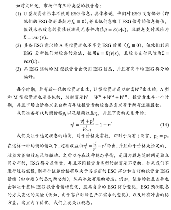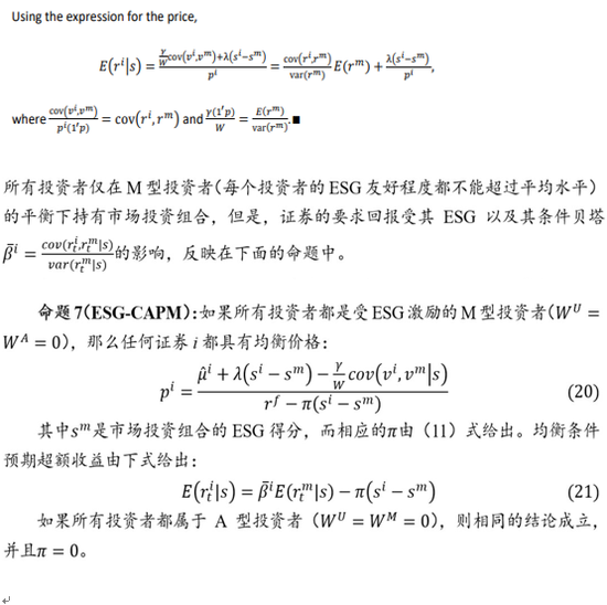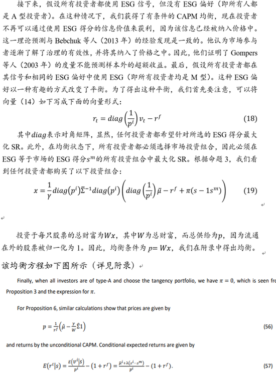 (注:这个部分内容主要是纯学术的理论建模,涉及很多数学公式,故下文以图像显示。这个章节讨论了三类ESG投资者的信息偏好对CAPM均衡价格的影响。)