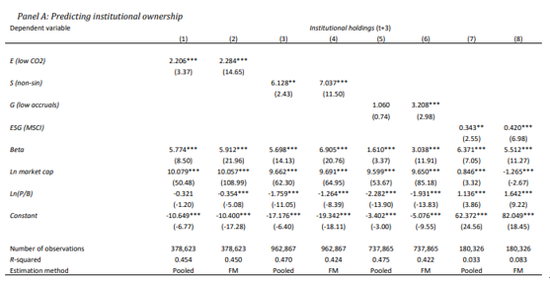 正如前文在理论与模型部分所解释的那样,与公司的未来基本面的相关性本身不足以确定ESG变量是会提高收益还是降低收益。因此,从整体上看,还需要分析投资者对ESG的需求。在本节中,我们将考虑机构所有权、交易活动和签署的订单量,以捕捉投资者对拥有或购买特定一类股票的兴趣。