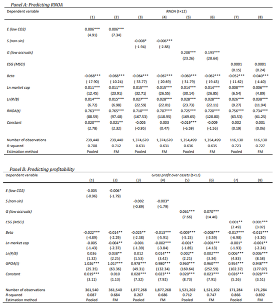 同经济学的其他信息价值一样,ESG信息能够产生正的超额收益的必要条件是它与未来的基本面相关。为了测试这种可能性,本篇论文将ESG替代变量与未来的基本面相关联,并在图表7中考虑了两个基本指标变量。在图7A中,本文考虑了“会计收益率”(accounting rate of returns),这是Richardson等人(2006)定义的净经营资产收益率。在图7B中,“资产毛利率”定义为收入与销售成本之差占总资产的比例,如Novy-Marx(2013)所述。在图7A和7B中,这些公司的基本面信息均在ESG变量之后的12个月进行了测算,并用这些未来12个月的盈利数据与现有的ESG因子评分进行统计回归分析。另外,对于第4.1节中定义的四种ESG替代变量中的每一种,本文提出两种计量规范:1)基于具有确定的月度影响值,且标准误差聚集在公司层面的汇总样本;2)基于Fama–MacBeth程序和Newey–West标准方差。最后,本篇论文还控制了公司的beta,规模和市净率等变量和,尽管这些控制变量对本篇论文的结果并不是至关重要的。