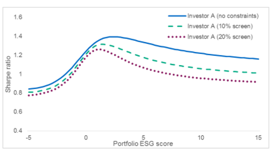此外,低ESG得分的资产可能是高ESG得分资产的有效对冲工具,并有可能通过增加对高ESG证券的投资来帮助投资者提高整体投资组合的夏普比率。通过筛选法,投资者可以最优地选择不让高ESG得分的资产在组合中占据过大的头寸。