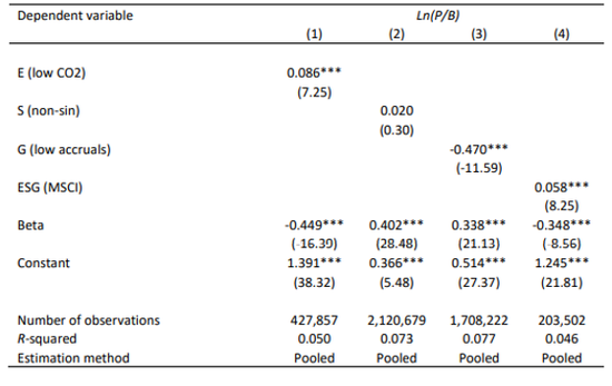 对于机构投资者来说,买卖股票除了基于对未来收益的预期,另外一个重要参数就是证券估值水平,二者高度相关。迄今为止的研究表明,至少有一些ESG替代变量(例如G)与未来的基本面密切相关。同时,本篇论文也发现一些证据表明,投资者倾向于将其ESG组合投资于G评分更具吸引力的股票。正如在前文的理论部分所显示的那样,这两种效应之间的相互作用可能会导致收益溢价或折价,具体取决于哪种效应更强。