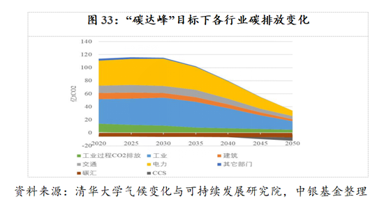 从碳排放的行业结构来看,目前中国80%的碳排放来自电力和工业部门,2030年“碳达峰”目标下,电力行业碳排放的降幅明显高于其他行业,承担主要的减排任务(图33)。
