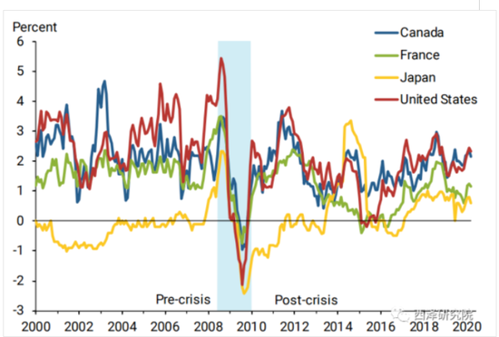 加拿大、法国、日本和美国的CPI同比(蓝色底纹表示全球金融危机)