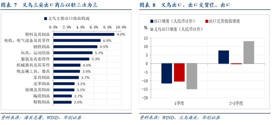 第三,义乌。今年2-3季度,义乌出口增速好于全国整体出口情况。义乌的出口一定程度上代表的是小企业的出口(注:根据数说义乌(2019年),2019年义乌工业生产中,规模以上工业增加值仅占全部工业增加值的37%。而全国,这一比例可能在80%以上)。今年1季度,出口交货值增速(-10.3% >出口增速(-11.4%)>义乌出口增速(-14.7%)。而2-3季度,出口交货值增速(0%)<出口增速(7.5%)<义乌出口增速(12.92%),反映2-3季度,可能是小企业出口更好,使得出口交货值增速不如出口增速。从义乌的出口结构看,更多是偏轻工业制品,如塑料制品、玩具、服装、家具、皮革、陶瓷、鞋靴等。