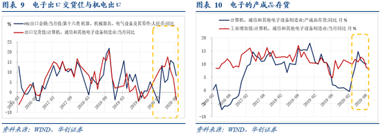 第二步,检查工业生产与存货。如果存货因素干扰存在的话,企业知道前期生产的商品并未顺利报关出口(这些商品由于所有权尚未转移,不能确认收入,可能还是以存货形式计入报表中),可能在后期相应减少相关商品的生产。我们发现,3-6月,计算机、通信和其他电子设备制造业的生产增速逐月上行,存货上行。7-9月,生产增速逐月下行,存货回落。逻辑推演顺畅。
