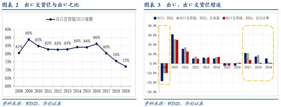 我们提示这一比值的持续下行中,出口交货值样本变动的干扰。出口交货值的同比增速,其公布值与出口增速相差不大,但出口交货值的同比若自行计算(今年除以去年),则明显低于公布的出口交货值的增速。比如2017年,出口增速为10.8%,出口交货值统计局公布的增速为10.7%,差别很小。但若按2017年的出口交货值除以2016年的数,则增速仅有3.4%。相当于2017年的规上企业相比2016年的,出口交货值的体量略小一些。这一趋势一直持续至今年(2020年前9个月,出口交货值增速公布值为-3.1%,自行计算值为-4.8%)。