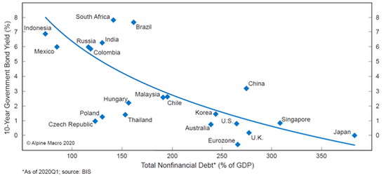 相反,很多欠发达国家或者是一些新兴市场、发展中国家,它们整体的债务很低,但是它们的利率却非常高。当然我们可以讲资金在发达国家更多,在发展中国家更少,所以有利率上的差别。