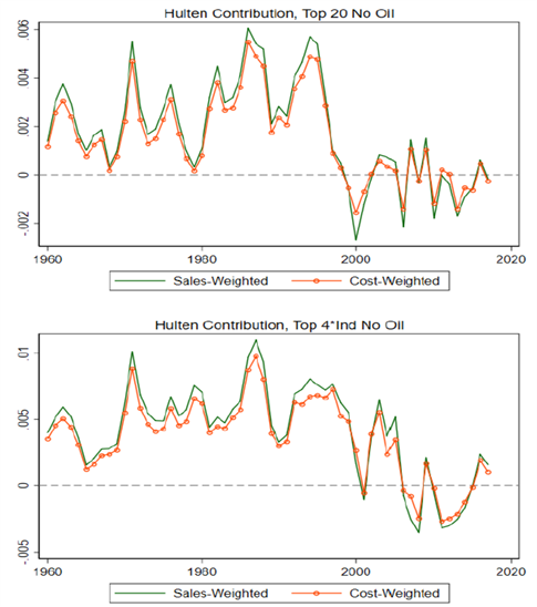 研究发现无论怎么去衡量,现在特别是2000年以后的大企业,它们对实体经济,对其它企业的帮助其实是越来越少了。原因并不太明显,因为我们一方面感受到大企业带来生活中效率的提高,但是大企业的垄断性也越来越强了。