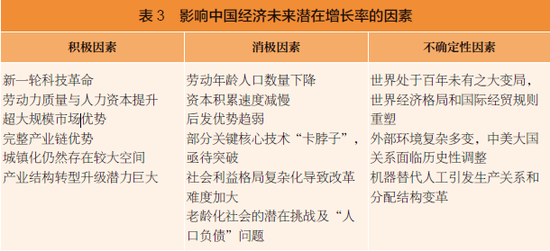 综上所述,文献中影响未来中国潜在经济增长率的因素大体上可归纳为三类:积极因素、消极因素及不确定因素(见表3)。其中,积极因素主要包括新一轮科技革命的带动、劳动力质量与人力资本提升、超大规模市场优势、完整产业链优势、城镇化仍然存在较大空间、产业结构转型升级潜力巨大等;消极因素主要包括劳动年龄人口数量下降、资本积累速度减慢、后发优势趋弱、部分关键核心技术“卡脖子”亟待突破、社会利益格局复杂化导致改革难度加大、老龄化社会的潜在挑战及“人口负债”问题等;不确定性较大的因素主要包括世界处于百年未有之大变局、世界经济格局和国际经贸规则重塑、外部环境复杂多变、中美大国关系面临历史性调整、机器替代人工可能引发生产关系和分配结构变革等。