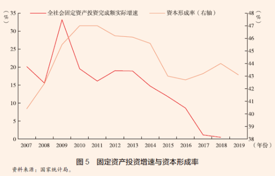 21 世纪初到2008 年全球金融危机前后,我国的固定资产投资增速持续攀升,资本积累对经济增长的贡献一度较大。然而在过去十年间,投资增速大幅下滑,全社会固定资产投资完成额实际增速已由金融危机前的20% 以上降至2018 年的0.47%。资本形成对GDP 增长的拉动率亦由金融危机前的6.3 个百分点持续降至2019 年的1.9 个百分点。与此同时,资本形成率由47% 的高点降至43% 左右(见图5)。根据“储蓄= 投资+ 净出口”国民经济恒等式,未来我国储蓄率受人口结构老龄化的影响将处于下降趋势,这意味着在净出口/GDP 基本不变的情况下,投资率大概率仍将处于下降趋势,资本积累对经济增长的拉动作用可能继续趋于减弱。