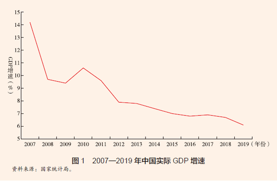 经济增长速度持续放缓是过去十多年来我国宏观经济中最为突出的一个特征事实。实际GDP 增长率已由2008 年全球金融危机前的14.2% 降低至2019 年的6.1%(见图1)。与此同时,不论是生产法核算视角的三大产业增速,还是支出法核算视角的投资、消费、进出口贸易增速,抑或是收入法核算视角的工资增速、资本回报率和税收收入增速等,均呈现出不同幅度的下降。判断经济增速的合意性,不仅要看经济增长率绝对水平的高低,更要看实际经济增长率与潜在经济增长率的相对高低。正因如此,潜在增长率成为当前我国宏观经济学研究和政策讨论中绕不过去的一个“枢纽性”问题。从短期来看,潜在增长率水平直接影响到对产出缺口和宏观经济景气冷热度的判断,进而影响着财政货币等逆周期调节政策的定调和力度把握。更重要的是,从中长期来看,潜在增长率关系到对“十四五”规划、第二个“百年目标”等国家发展战略规划的研判部署,以及社会保障体系改革、城市结构与乡村治理、交通电力基础设施投资、人口生育政策等一系列公共政策的统筹制定。近年来我国经济学界和政策制定中多次兴起关于潜在增长率的讨论,其中颇具代表性的是2019 年底关于“保6”的大讨论,围绕的关键问题之一即是中国经济的潜在增长率是在6% 以上还是6% 以下。