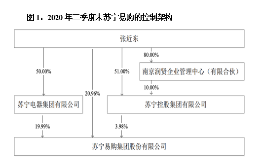 图1展示的是上市公司苏宁易购的控制架构。张近东直接持股苏宁易购21%,通过苏宁电器持股苏宁易购20%,通过苏宁控股持有苏宁易购4%的股份。淘宝(中国)也持有苏宁易购20%的股份,与苏宁电器并列第二大股东。