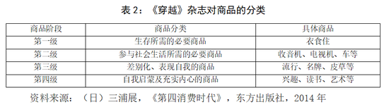 第四,从物质到精神。当物质充裕之后,人们开始看重商品的精神属性,追求“小确幸”。根据马斯洛的需求理论,人与生俱来从低到高有五种需求:生理需求、安全需求、归属与爱的需求、尊重的需求和自我实现需求。人在任何时代都是有这些需求的,只是被满足的程度不同。消费在低阶需求满足后会向高阶跃进。日本正向消费成熟社会探索。1983年日本PARCO百货集团的《穿越》杂志把商品分为四个级别,反映了消费需求层次,与现实的发展过程吻合。