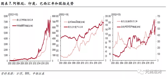 在特定时期,尤其是当美国收紧流动性情况下,新兴市场容易发生货币危机,并伴随资产价格的大幅调整。例如,2018年在全球美元流动性收紧的背景下,叠加二季度之后全球贸易摩擦不断升级,国际资本从新兴市场流出,阿根廷比索、巴西雷亚尔均承受较大调整压力,分别贬值49.4%、19.8%,阿根廷MERV指数、圣保罗IBOVESPA指数分别较年初高点下跌了16.6%、12.5%,此时汇率和股价又表现出一致走势。