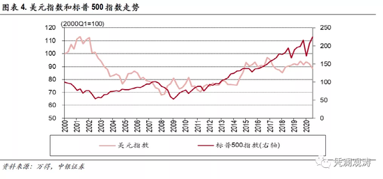 彭博数据显示,标普500指数成分股中约有45.0%的收入来自海外。因此,理论上,美元走强会损害跨国公司的海外盈利,导致股市下跌。但是2000Q1至2020Q3期间,美元指数和标普500指数的总体相关性较弱,相关系数仅为0.17。从图表4也可以看出,2003年之后美元走弱、美股反弹;2008年金融危机后,美元总体走强,美股也走出了十年长牛;2020年3月份流动性危机过后,美元从102的高位回落至91附近,美股则出现明显反弹,至今标普500指数已超过年初水平。